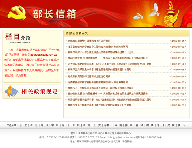 中共五河縣委組織部“部長信箱”于2012年2月正式開通,地址為bbwhzzb@ahxf.gov.cn。歡迎廣大黨員干部群眾對五河縣組織工作提出寶貴意見和建議,通過電子郵件發(fā)至“部長信箱”,我們將安排專人認真瀏覽,及時呈報部長批閱,盡力回復。